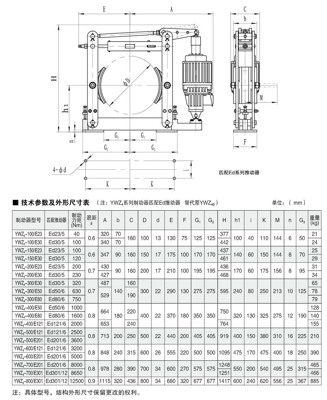 YWZ4(Ed)系列電力液壓鼓式制動器的連接尺寸和制動力矩參數符合JB/ZQ4388-86標準,技術要求符合JB / T6406-2006標準。